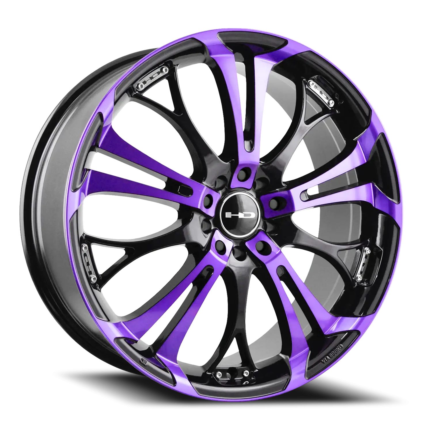 HD Wheels Spinout wheel features size 22" x 8.5", Gloss Black / Machined Face-Purple Clear Black / Machined Face-Purple Clear finish, 5×115/5×120 bolt pattern, +20mm offset.
