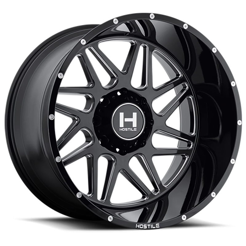 Hostile Sprocket H108 GB-M wheel features size 20" x 9", Gloss Black / Milled Black / Milled finish, 8×165.1 bolt pattern, +0mm offset.