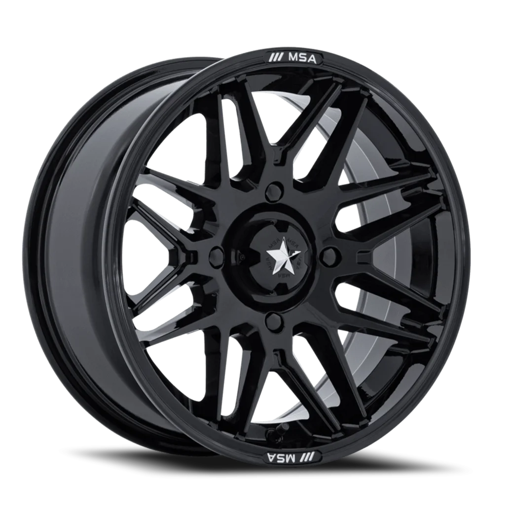 MSA Radar UTV M52 BX wheel features size 14" x 7", Black, Gloss Black finish, 4×110 bolt pattern, +10mm offset.