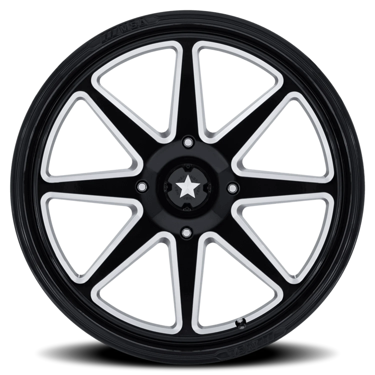 MSA Spark UTV M54 BE wheel features size 15" x 7", Black, Gloss Black / Milled finish, 4×110 bolt pattern, +10mm offset.