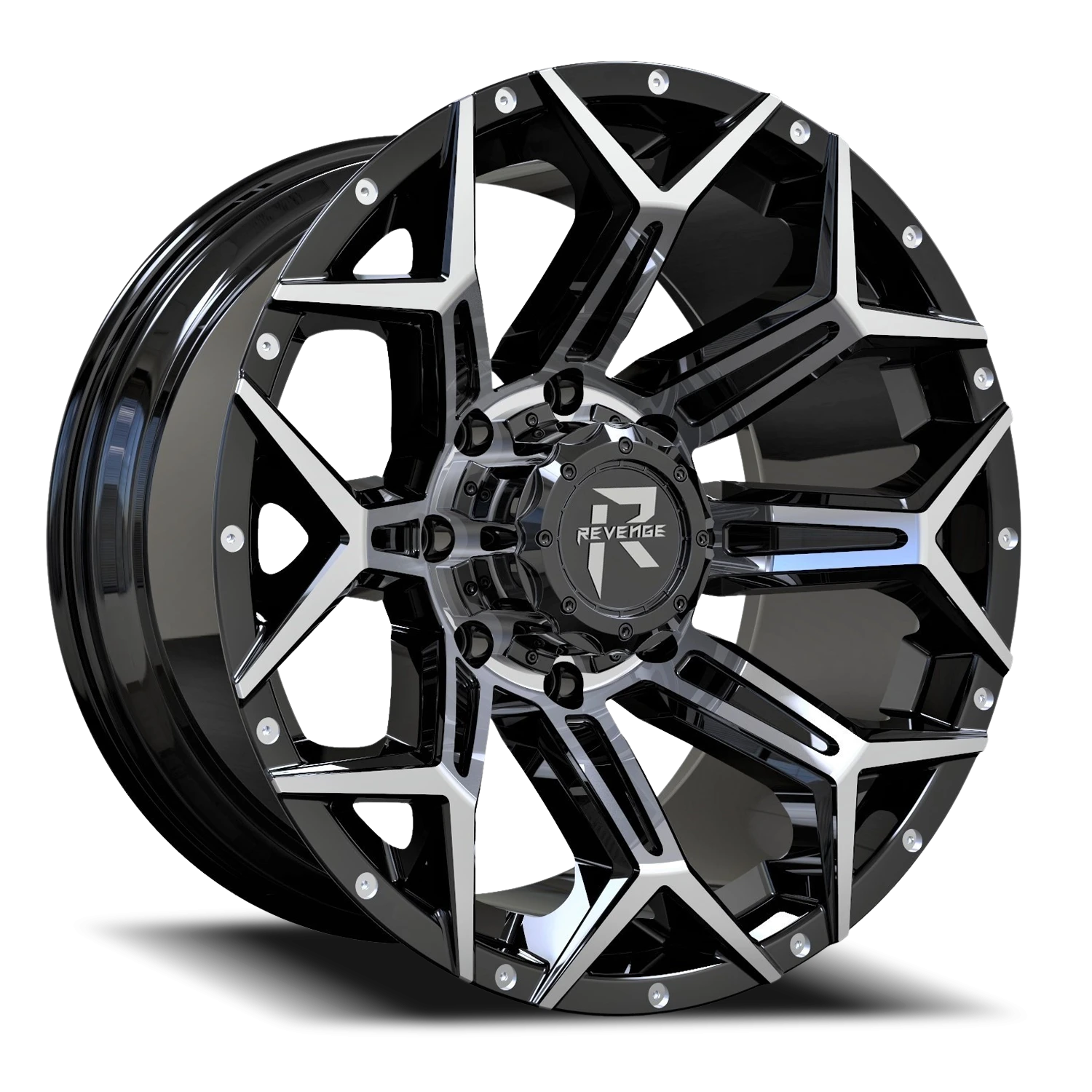 Revenge Offroad RV202 wheel features size 20" x 9", Black / Machined Black / Machined finish, 8×170 bolt pattern, +0mm offset.