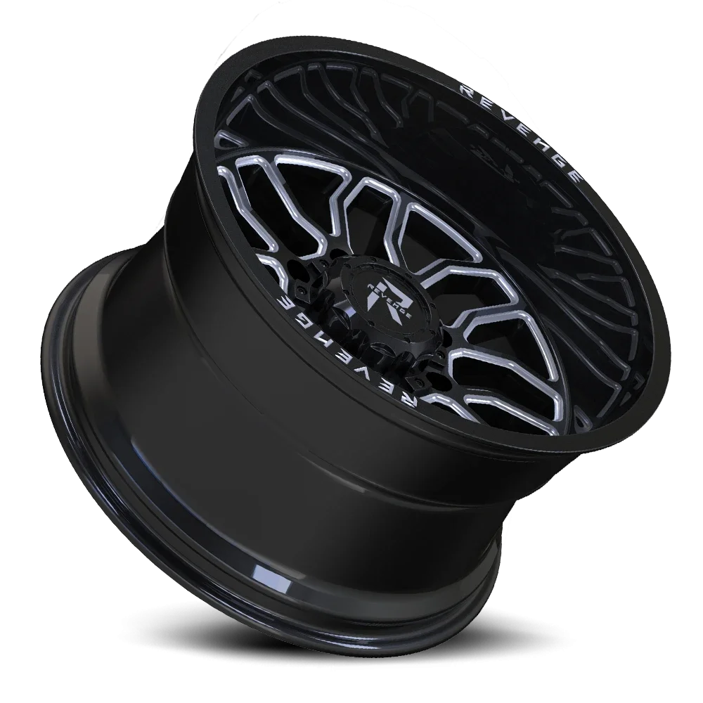 Revenge Offroad RV205 wheel features size 20" x 12", Black / Milled Black / Milled finish, 6×135/6×139.7 bolt pattern, -44mm offset.