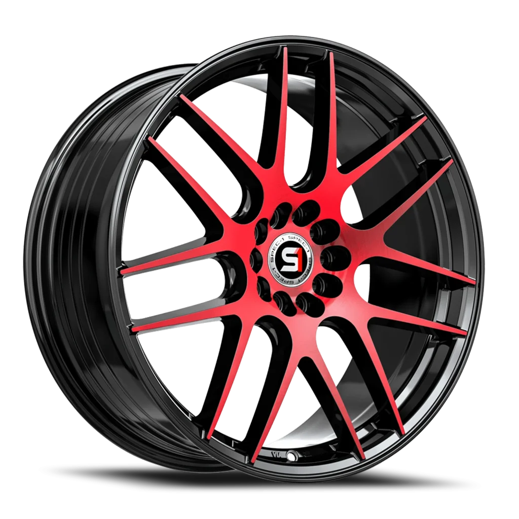 Spec-1 SP-65 wheel features size 17" x 8", Black, Gloss Black / Red Machined finish, 5×110/5×114.3 bolt pattern, +42mm offset.