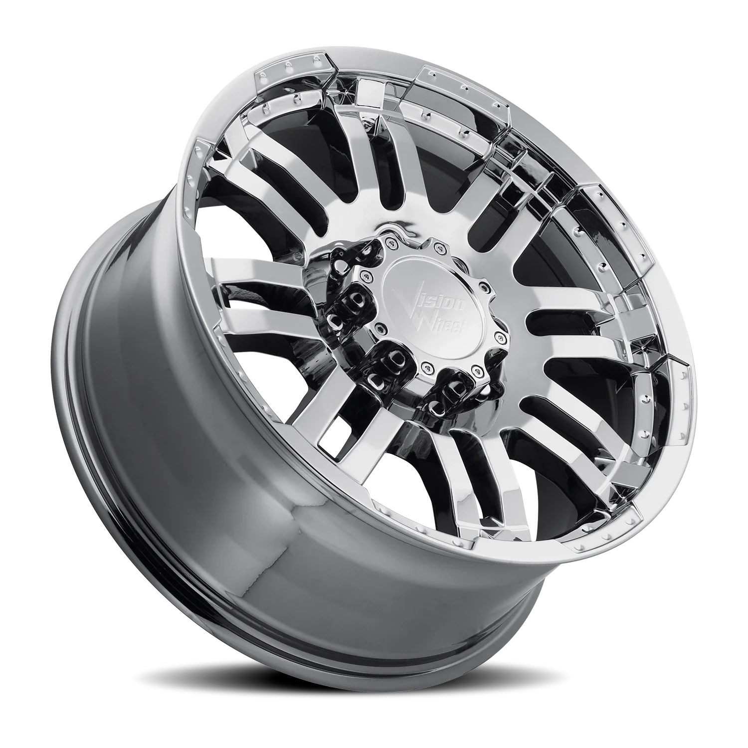 Vision 375 wheel features size 18" x 8.5", Chrome finish, 8×165.1 bolt pattern, +18mm offset.