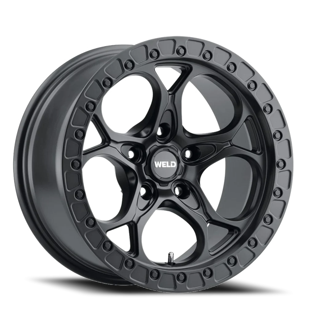 The Ledge W108 features the same look of the popular Ledge Beadlock wheel, but features a simulated beadlock ring for street use. Its rotary-formed construction results in an enviable combination of increased strength and reduced weight for performance both on and off-road. The Ledge W108 features an aggressively curved split five-spoke design currently offered in 17-inch sizes with a 5-lug Jeep bolt pattern. We finish it in smooth satin black with a satin black, street-legal, simulated beadlock ring . Its center cap is gloss black with a chrome WELD logo that stands out even behind dirt and mud.
