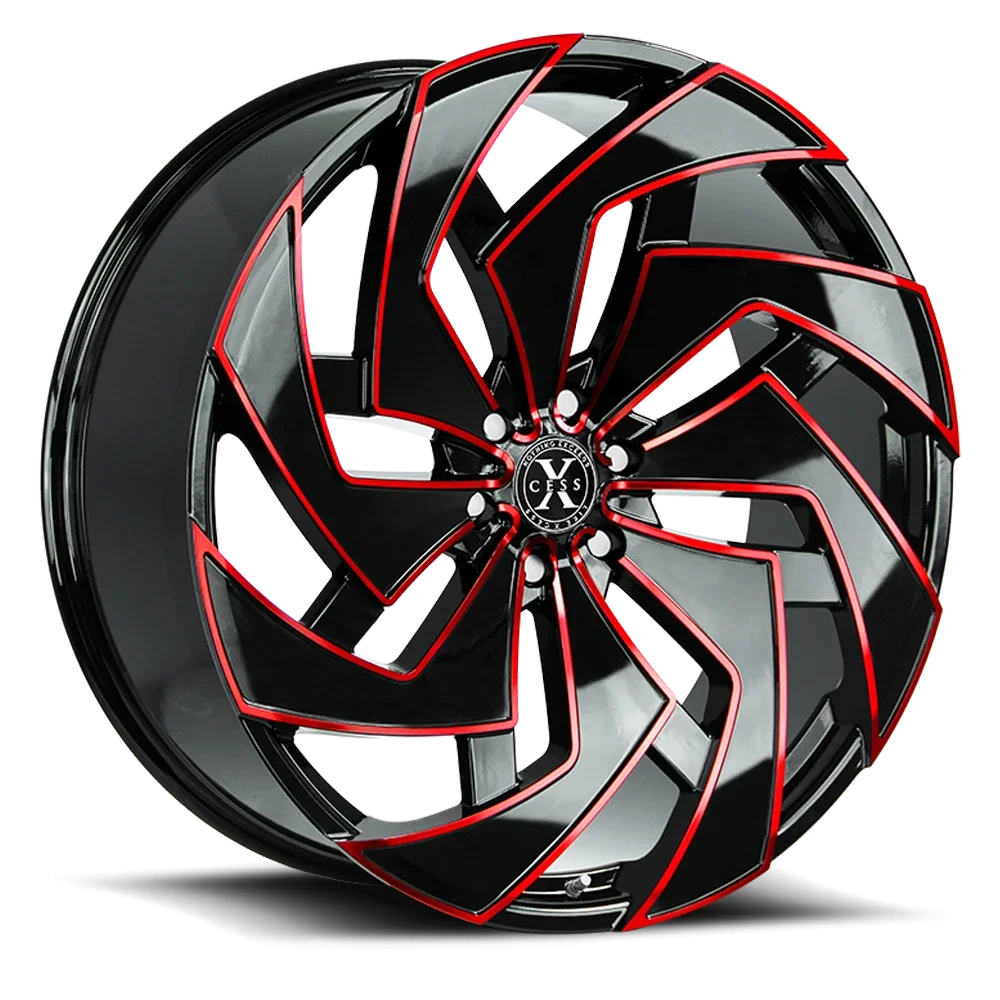 Xcess X04 wheel features size 22" x 9", Black, Gloss Black / Candy Red Milled finish, 6×139.7 bolt pattern, +24mm offset.