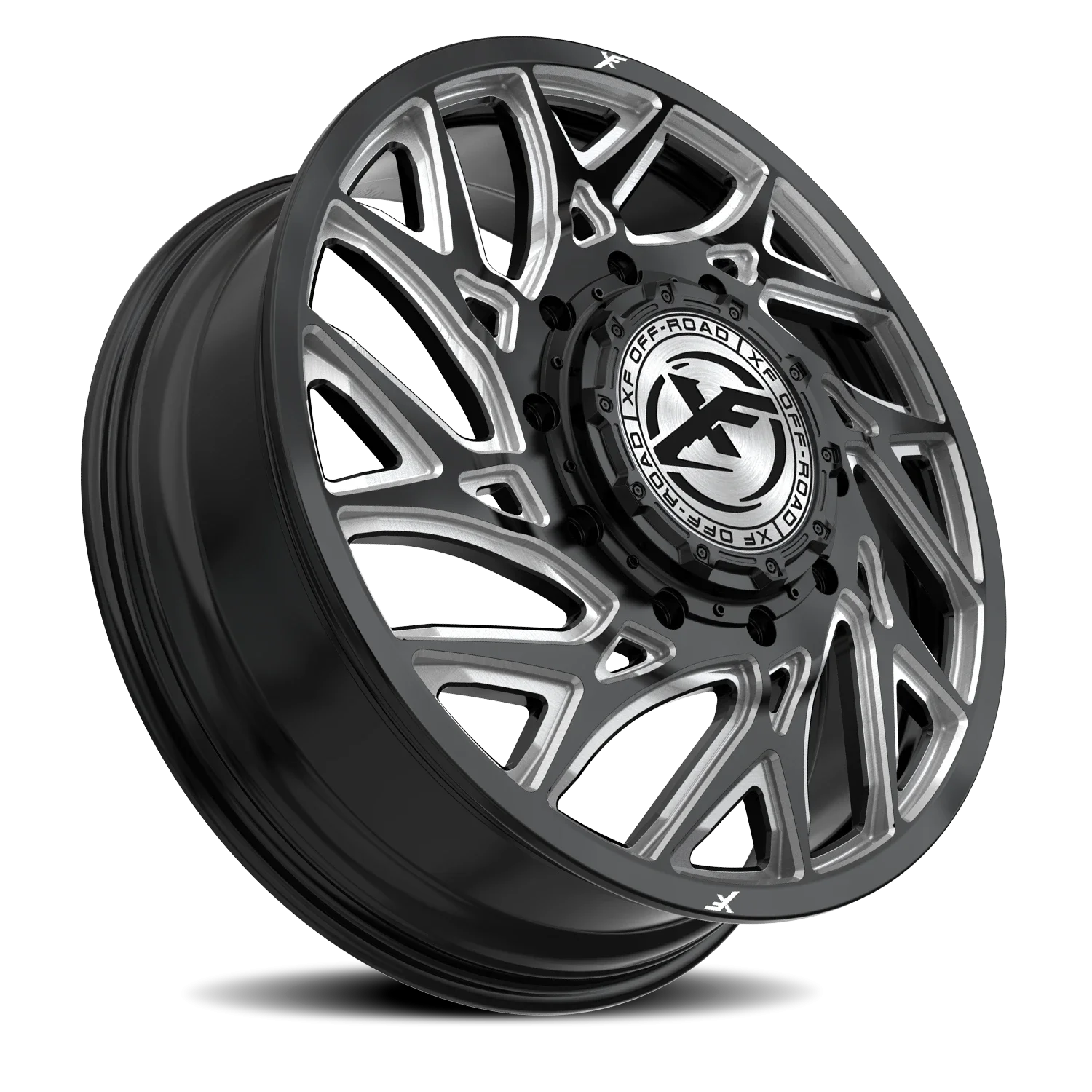 XF Off-Road XF-229 Dually wheel features size 22" x 8.25", Black, Gloss Black / Milled finish, 10×225 bolt pattern, +110mm offset.